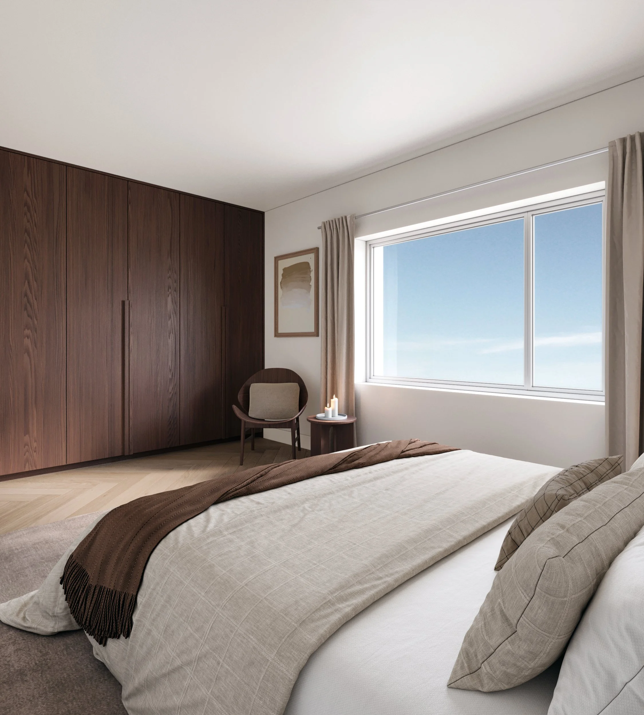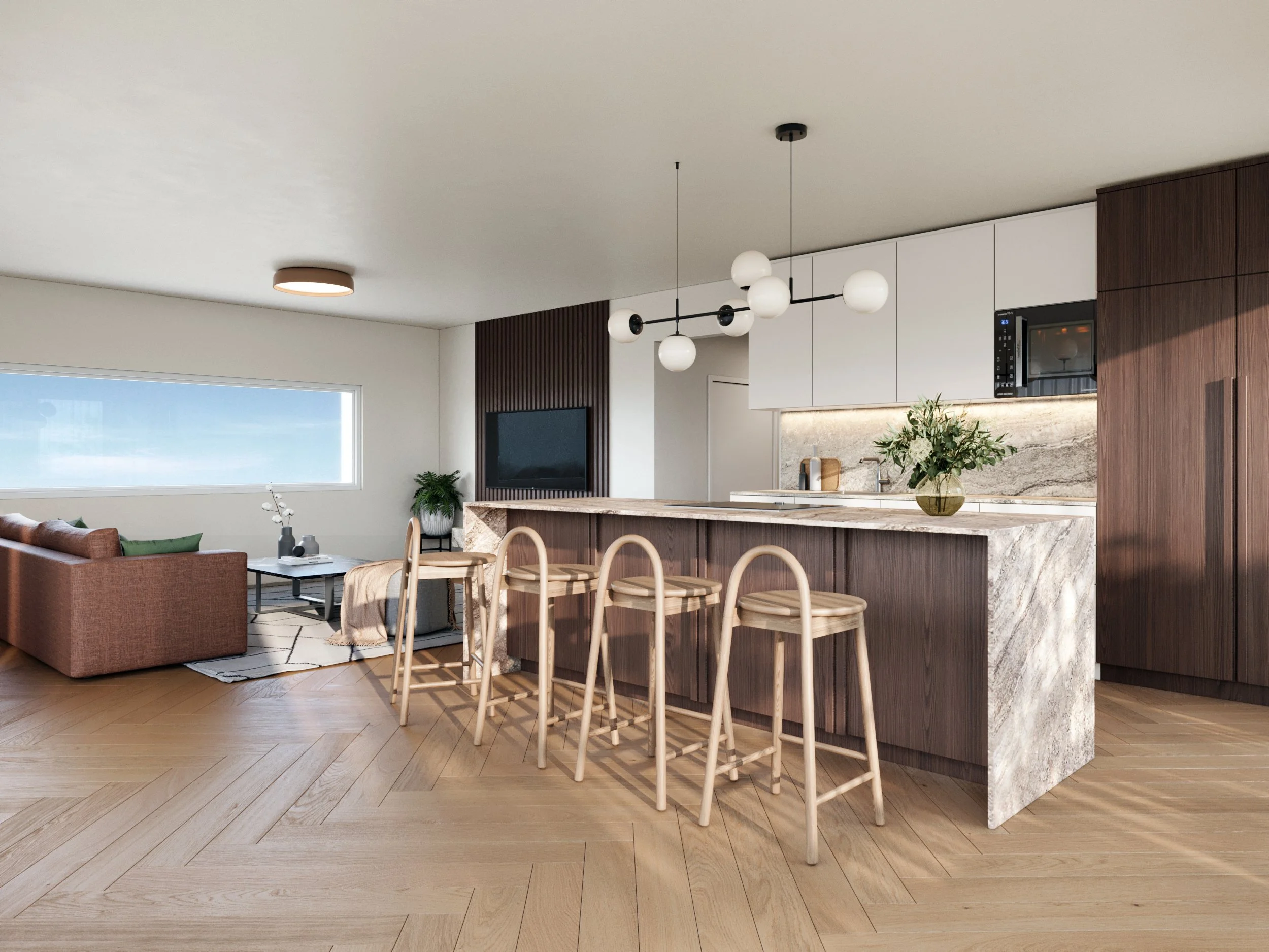 Sisätilaa täydentävät poikkeuksellisen laajat terassialueet, parhaimmillaan jopa noin 80 m2. Ne eivät ole lisä, vaan olennainen osa arkkitehtuuria, laajentaen asumista merkittävästi ulkotilaan.